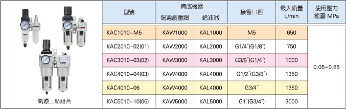 三點組合 KAC1000-M5 , KAC2000-02 , KAC2000-01 , KAC2500-03 , KAC2500-02 , KAC3000-03 , KAC3000-02 , KAC4000-04 , KAC4000-03 , KAC4000-06 , KAC5000-10 , KAC5000-06 二點組合 KAC1010-M5 , KAC2010-02 , KAC2010-01