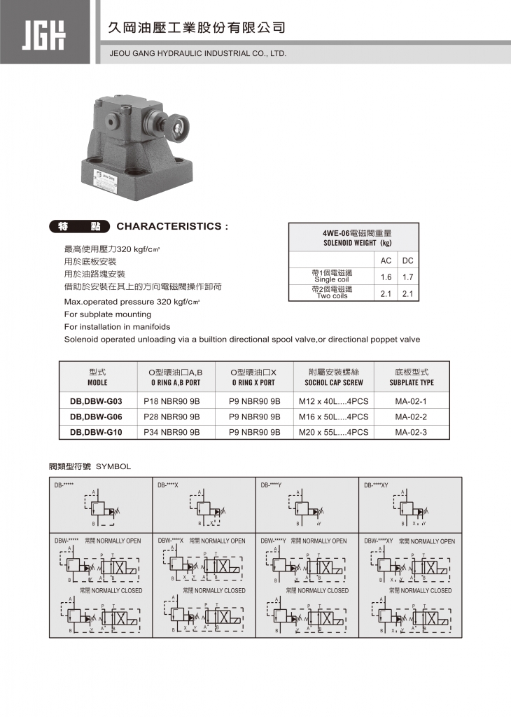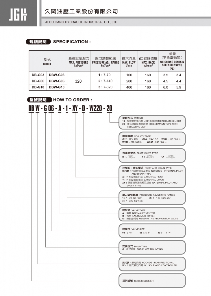 JGH電磁控制溢流閥常規(guī)型號(hào)參考:DB-G03-A-1 , DB-G03-A-2 , DB-G03-A-3 , DB-G03-B-1 , DB-G03-B-2 , DB-G03-B-3 , DB-G03-E-1 , DB-G03-E-2 , DB-G03-E-3 , DB-G06-A-1 , DB-G06-A-2 , DB-G06-A-3 , DB-G06-B-1 , DB-G06-B-2 , DB-G06-B-3 , DB-G06-E-1 , DB-G06-E-2 , DB-G06-E-3 , DB-G10-A-1 , DB-G10-A-2 , DB-G10-A-3 , DB-G10-B-1 , DB-G10-B-2 , DB-G10-B-3 , DB-G10-E-1 , DB-G10-E-2 , DB-G10-E-3 , DBW-G03-A-1 , DBW-G03-A-2 , DBW-G03-A-3 , DBW-G03-B-1 , DBW-G03-B-2 , DBW-G03-B-3 , DBW-G03-E-1 , DBW-G03-E-2 , DBW-G03-E-3 , DBW-G06-A-1 , DBW-G06-A-2 , DBW-G06-A-3 , DBW-G06-B-1 , DBW-G06-B-2 , DBW-G06-B-3 , DBW-G06-E-1 , DBW-G06-E-2 , DBW-G06-E-3 , DBW-G10-A-1 , DBW-G10-A-2 , DBW-G10-A-3 , DBW-G10-B-1 , DBW-G10-B-2 , DBW-G10-B-3 , DBW-G10-E-1 , DBW-G10-E-2 , DBW-G10-E-3