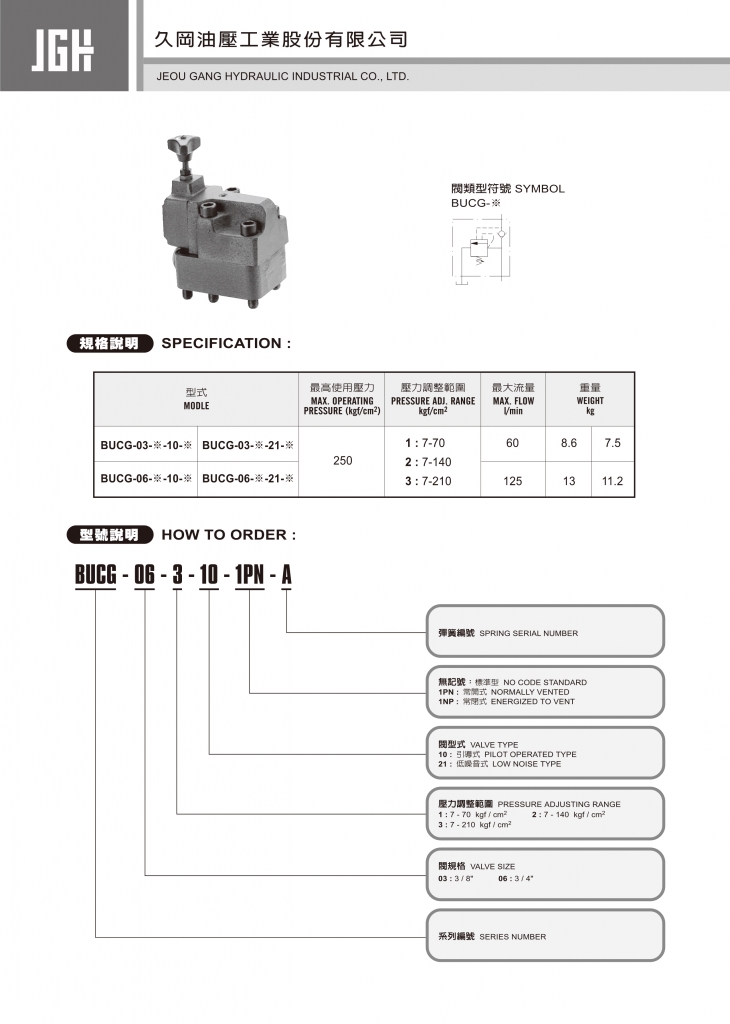 規(guī)格說明 型式 最高使用壓力 kgf/cm?2 壓力調(diào)整範(fàn)圍 kgf/cm?2 最大流量 l/min 重量 kg BUCG-03-※-10-※ BUCG-03-※-21-※ 250 1 :?7-70 2 :?7-140 3 :?7-210 60 8.6 7.5 BUCG-06-※-10-※ BUCG-06-※-21-※ 125 13 11.2 JGH載溢流閥常規(guī)型號參考:BUCG-03-1-10-