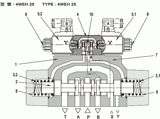 • 此類閥組成主要包括閥體(1)、控制閥芯(2)和一個或二個復位彈簧(3.1)和(3.2)的主閥及帶一個或二個電磁”a”(5.1), 電磁閥”b”(5.2)的先導閥(4)。