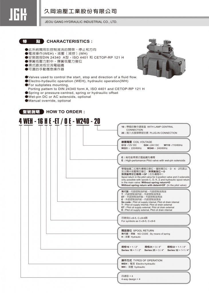 • WEH型方向閥是帶電-液操作的方向滑閥,用以控制液流的開啟、停止和方向。