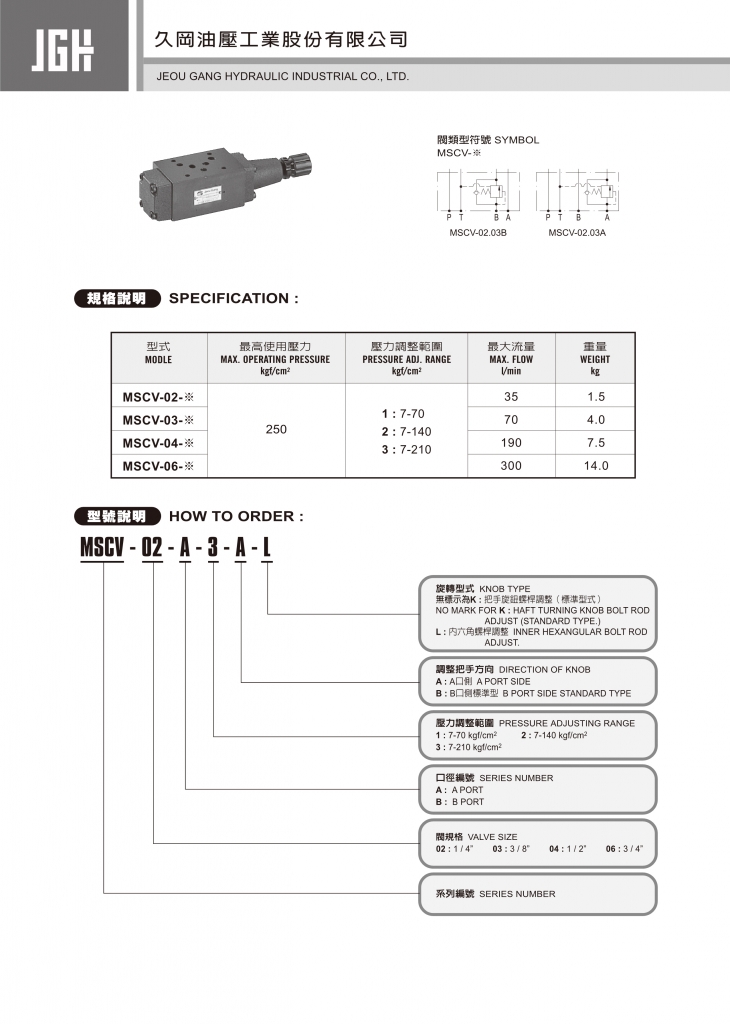規(guī)格說明 型式 最高使用壓力 kgf/cm2 壓力調(diào)整範(fàn)圍 kgf/cm2 最大流量 l/min 重量 kg MSCV-02-※ 250 1 :?7-70 2 :?7-140 3 :?7-210 35 1.5 MSCV-03-※ 70 4.0 MSCV-04-※ 190 7.5 MSCV-06-※ 300 14.0 JGH久岡疊加式控制閥部分常規(guī)型號參考:MSCV-02-A-1-A , MSCV-