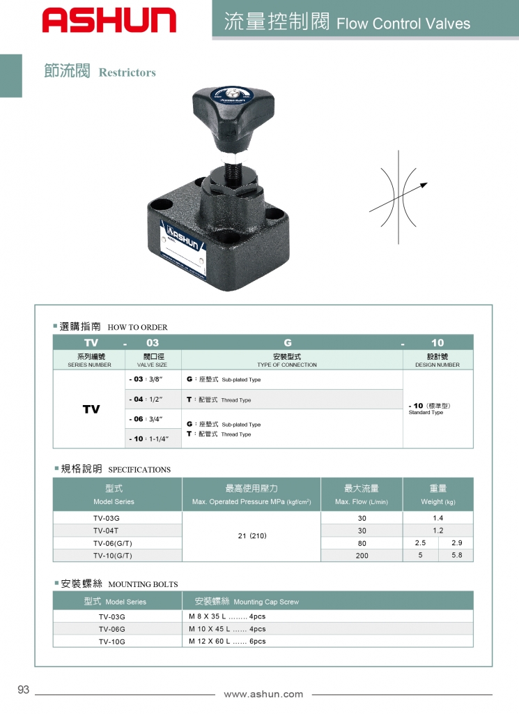 ASHUN節(jié)流閥常規(guī)型號(hào)參考:TV-03G-10 , TV-04T-10 , TV-06G-10 , TV-06T-10 , TV-10G-10 , TV-10T-10