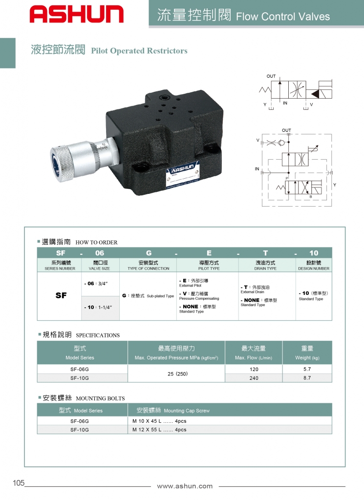 ASHUN液控節(jié)流閥常規(guī)型號參考:SF-10G-10 , SF-06G-10 , SF-10G-T-10 , SF-06G-T-10 , SF-10G-V-10 , SF-06G-V-10 , SF-10G-V-T-10 , SF-06G-V-T-10 , SF-10G-E-10 , SF-06G-E-10 , SF-10G-E-T-10 , SF-06G-E-T-10