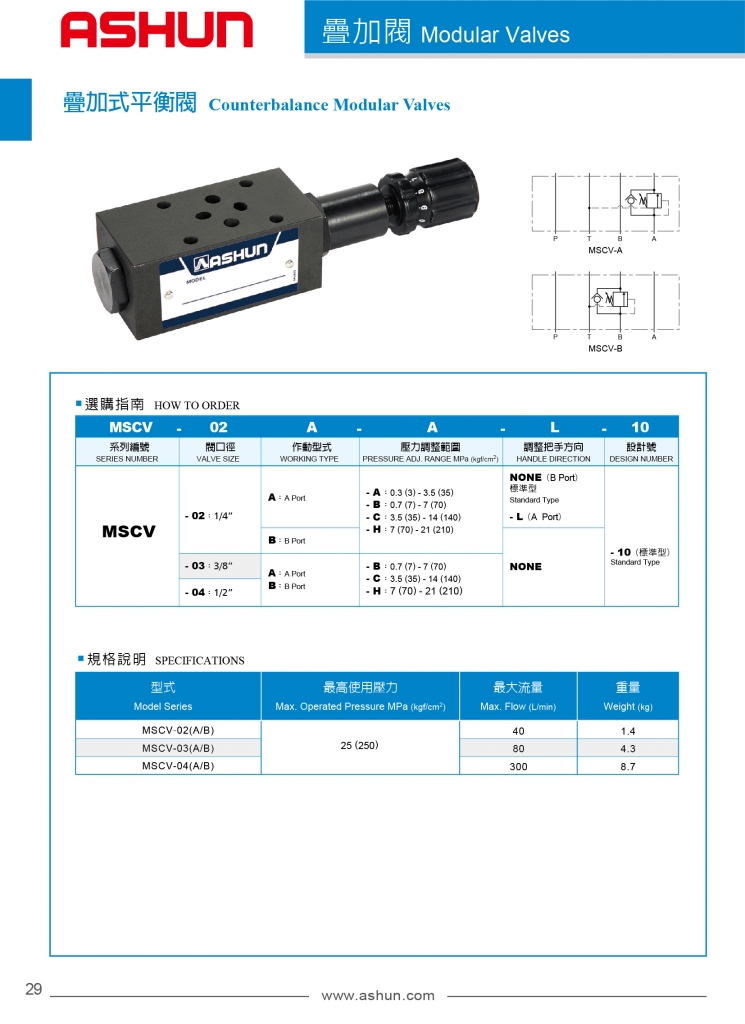 ASHUN疊加式平衡閥常規(guī)型號(hào)參考:MSCV-02A-A-10 , MSCV-02A-A-L-10 , MSCV-02A-B-10 , MSCV-02A-B-L-10 , MSCV-02A-C-10 , MSCV-02A-C-L-10 , MSCV-02A-H-10 , MSCV-02A-H-L-10 , MSCV-02B-A-10 , MSCV-02B-A-L-10 , MSCV-02B-B-10 , MSCV-02B-B-L-10 , MSCV-02B-C-10 , MSCV-02B-C-L-10 , MSCV-02B-H-10 , MSCV-02B-H-L-10 , MSCV-03A-B-10 , MSCV-03A-C-10 , MSCV-03A-H-10 , MSCV-03B-B-10 , MSCV-03B-C-10 , MSCV-03B-H-10 , MSCV-04A-B-10 , MSCV-04A-C-10 , MSCV-04A-H-10 , MSCV-04B-B-10 , MSCV-04B-C-10 , MSCV-04B-H-10
