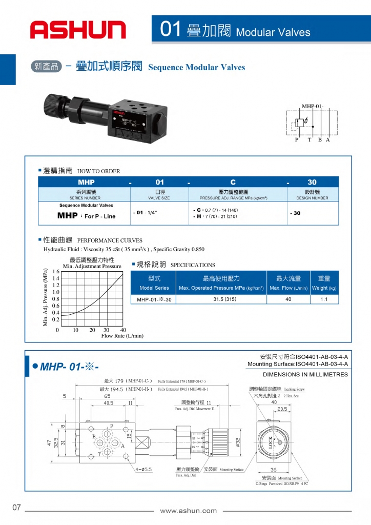 ASHUN疊加式順序閥常規(guī)型號(hào)參考:MHP-01-C-30 , MHP-01-H-30