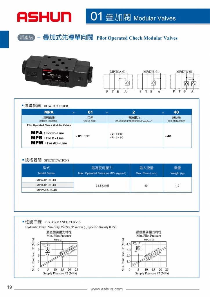 ASHUN疊加式先導(dǎo)單向閥常規(guī)型號參考:MPA-01-2-40 , MPA-01-4-40 , MPB-01-2-40 , MPB-01-4-40 , MPW-01-2-40 , MPW-01-4-40