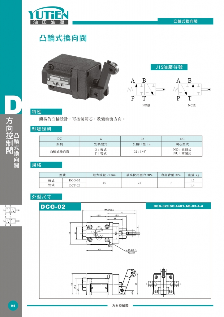 YUTIEN凸輪式換向閥部分常規(guī)型號參考:DCG-02-NC , DCG-02-NO , DCT-02-NC , DCT-02-NO ,