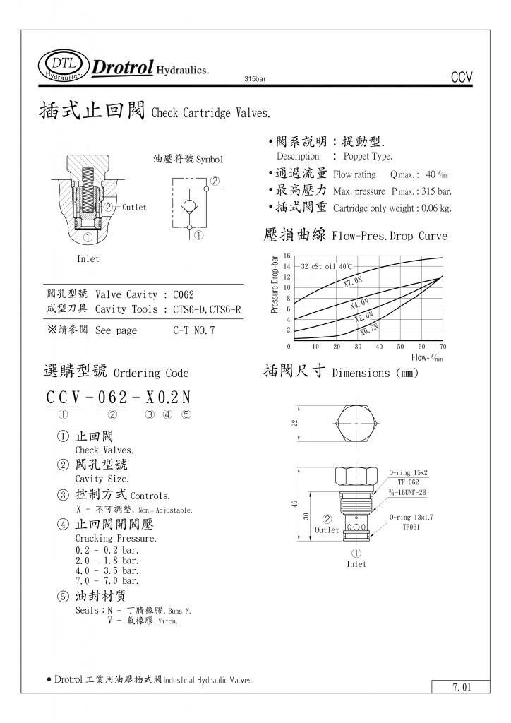 DTL插式止回閥部分常規(guī)型號參考:CCV-062-X0.2N , CCV-062-X0.2V , CCV-062-X2.0N , CCV-062-X2.0V , CCV-062-X4.0N , CCV-062-X4.0V , CCV-062-X7.0N , CCV-062-X7.0V ,