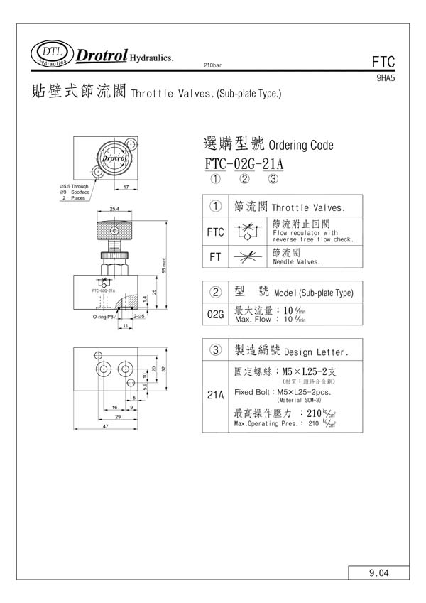 DTL貼壁式節(jié)流閥部分常規(guī)型號參考:FT-02G-21A , FTC-02G-21A