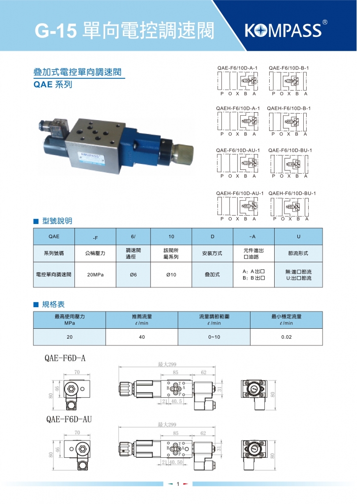KOMPASS疊加式電控單向調(diào)速閥部分常規(guī)型號(hào)參考:QAE-F6/10D-A , QAE-F6/10D-AU , QAE-F6/10D-B , QAE-F6/10D-BU