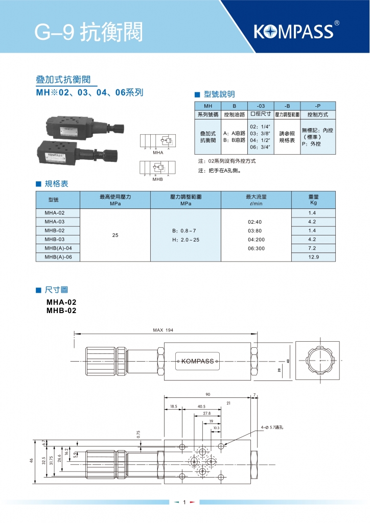 KOMPASS康百世疊加閥 MHA,MHB-02,03,04,06系列疊加式抗衡閥