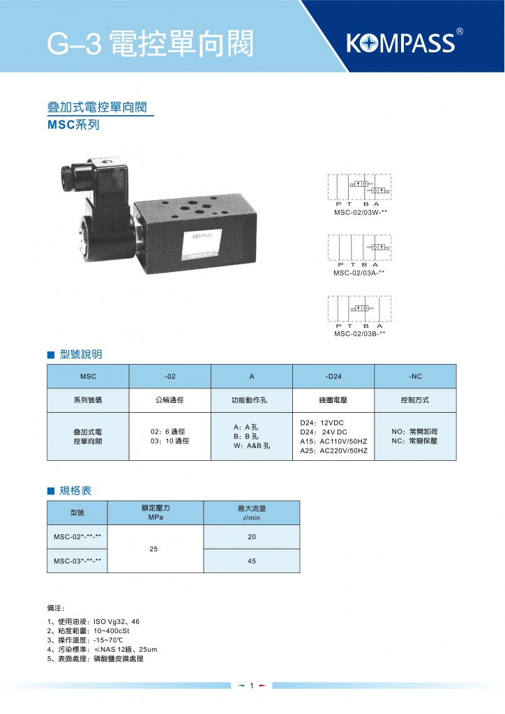 KOMPASS康百世疊加閥 MSC-02,03系列疊加式電控單向閥