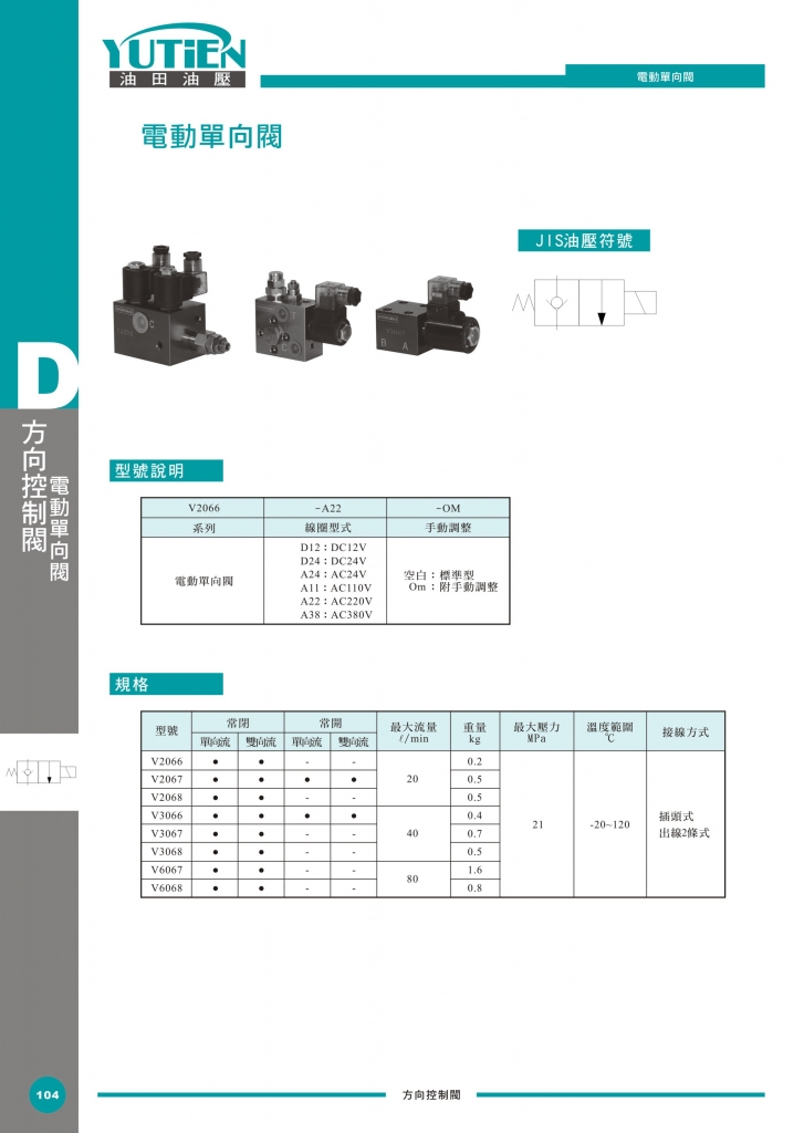 YUTIEN電動(dòng)單向閥部分常規(guī)型號(hào)參考:V2066-A11 , V2066-A11-OM , V2066-A22 , V2066-A22-OM , V2066-A24 , V2066-A24-OM , V2066-A38 , V2066-A38-OM , V2066-D12 , V2066-D12-OM , V2066-D24 , V2066-D24-OM , V2067-A11 , V2067-A11-OM , V2067-A22 , V2067-A22-OM , V2067-A24 , V2067-A24-OM , V2067-A38 , V2067-A38-OM , V2067-D12 , V2067-D12-OM , V2067-D24 , V2067-D24-OM , V2068-A11 , V2068-A11-OM , V2068-A22 , V2068-A22-OM , V2068-A24 , V2068-A24-OM , V2068-A38 , V2068-A38-OM , V2068-D12 , V2068-D12-OM , V2068-D24 , V2068-D24-OM , V3066-A11 , V3066-A11-OM , V3066-A22 , V3066-A22-OM , V3066-A24 , V3066-A24-OM , V3066-A38 , V3066-A38-OM , V3066-D12 , V3066-D12-OM , V3066-D24 , V3066-D24-OM , V3067-A11 , V3067-A11-OM , V3067-A22 , V3067-A22-OM , V3067-A24 , V3067-A24-OM , V3067-A38 , V3067-A38-OM , V3067-D12 , V3067-D12-OM , V3067-D24 , V3067-D24-OM , V3068-A11 , V3068-A11-OM , V3068-A22 , V3068-A22-OM , V3068-A24 , V3068-A24-OM , V3068-A38 , V3068-A38-OM , V3068-D12 , V3068-D12-OM , V3068-D24 , V3068-D24-OM , V6067-A11 , V6067-A11-OM , V6067-A22 , V6067-A22-OM , V6067-A24 , V6067-A24-OM , V6067-A38 , V6067-A38-OM , V6067-D12 , V6067-D12-OM , V6067-D24 , V6067-D24-OM , V6068-A11 , V6068-A11-OM , V6068-A22 , V6068-A22-OM , V6068-A24 , V6068-A24-OM , V6068-A38 , V6068-A38-OM , V6068-D12 , V6068-D12-OM , V6068-D24 , V6068-D24-OM