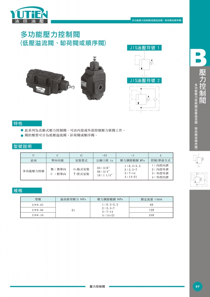YUTIEN多功能壓力控制閥部分常規(guī)型號參考:UG-03-2-3 , UT-10-4-3 , UT-10-4-4 , UG-10-4-4 , UG-10-4-3 , UT-06-2-3 , UT-10-3-4 , UG-10-3-4 , UG-06-2-3 , UT-10-3-3 , UT-10-2-4 , UG-10-2-4 , UG-10-3-3 , UT-03-3-3 , UT-10-1-4