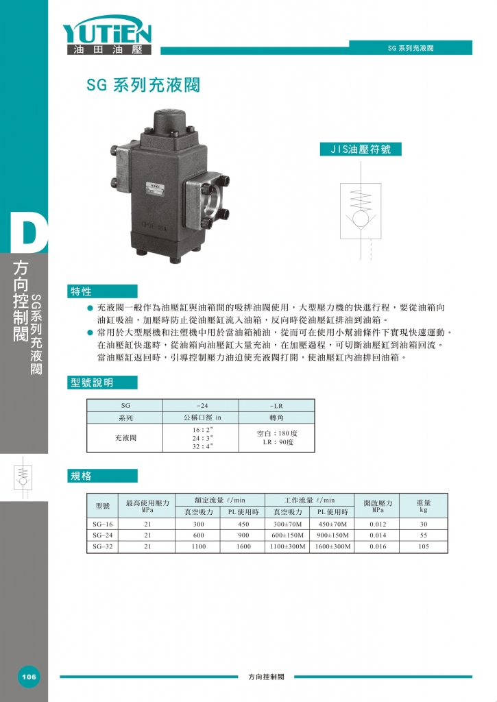 YUTIEN充液閥部分常規(guī)型號參考:SG-16 , SG-24 , SG-32 , SG-16-LR , SG-24-LR , SG-32-LR