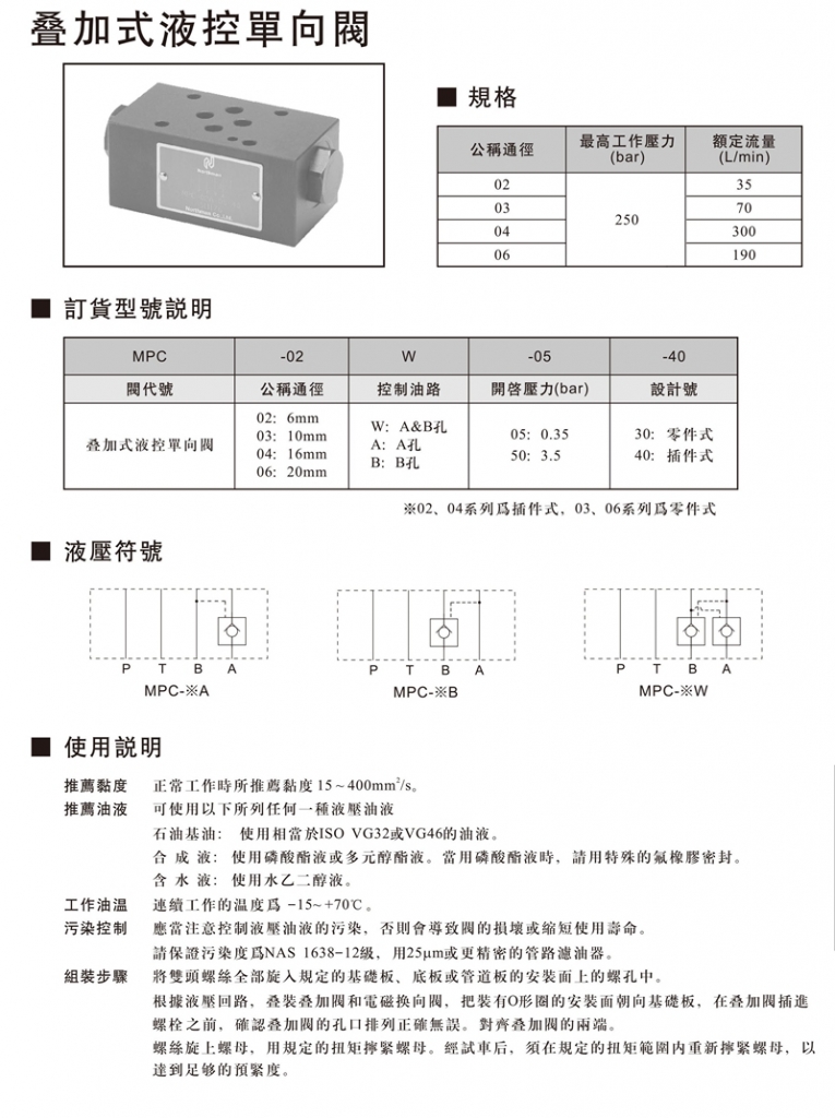 NORTHMAN北部精機疊加閥 MPC-02,03,04,06系列疊加式液控單向閥