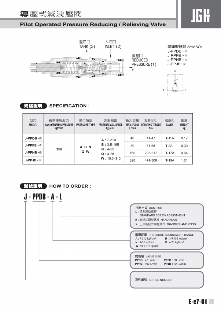 MODLE MAX.OPERATING PRESSURE kgf/cm2 PRESSURE TYPE PRESSURE ADJ.RANG kgf/cm2 MAX. FLOW l/min WEIGHT kg J-PPDB-※ 350 A K N Q W A:7-120 K:3.5-105 N:4-55 Q:4-25 W:10-315 40 0.17 J-PPFB-※ 80 0.3 J-PPHB-※