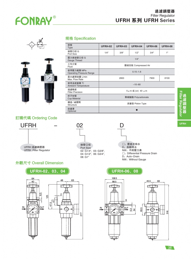 UFRH-02 1/4″ 壓縮空氣 0.15 ~ 1.6 2800 -10 ~ 60 5 μm 或 40 μm 聚碳酸酯