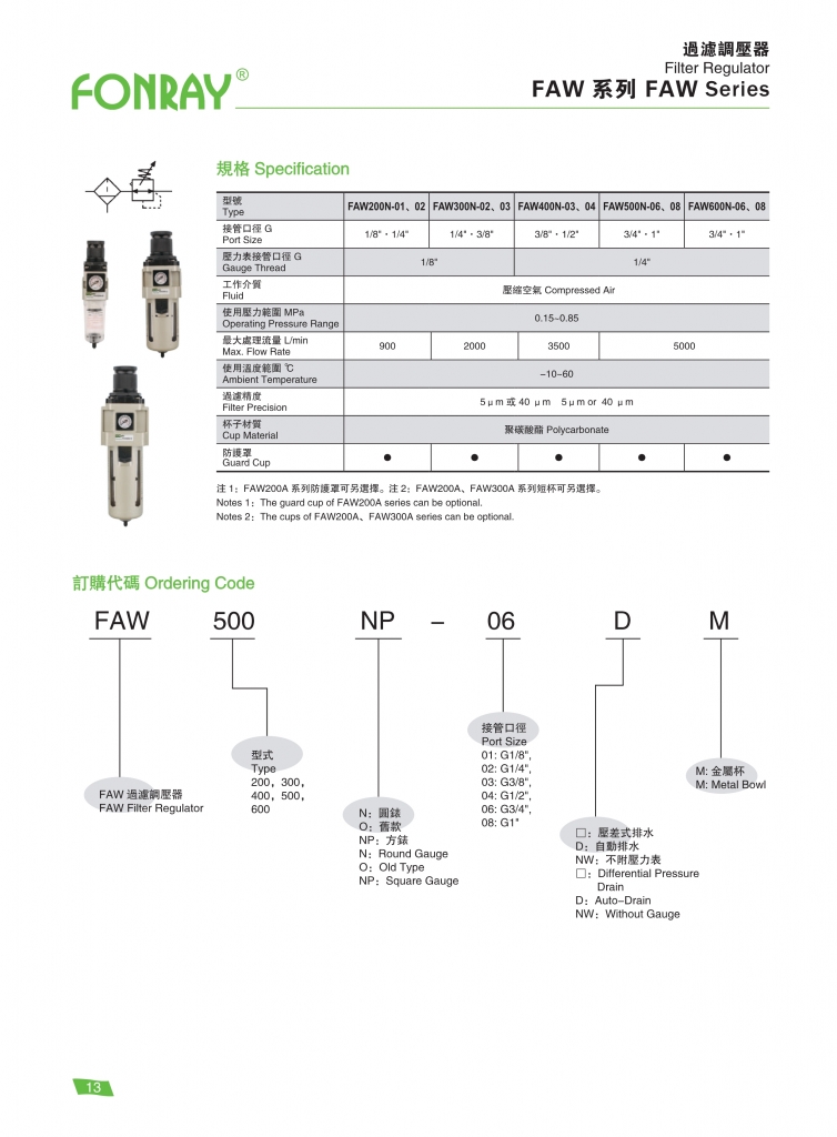 過濾調(diào)壓閥 – FAW 型號(hào) 接管口徑 (G/PT) 最大流量 (L/min) 過濾精度 (μm) 使用壓力範(fàn)圍 (Mpa) FAW200N-01 、 02 1/8″ 、 1/4″ 900 5 ( 泡棉 ) 20 ( 銅 ) 0.15 ~ 0.85 FAW300N-02 、 03 1/4″ 、 3/8″ 2000 FAW400N-03 、 04 3/8″ 、 1/2″ 3500 FAW