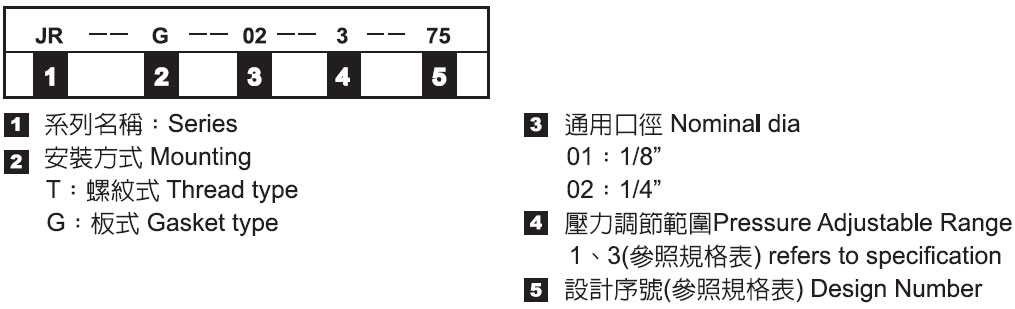 | 型號 | 適用口徑 DIA | 最大流量 (L/MIN) | 壓力調(diào)整範(fàn)圍 (KG/CM2) |