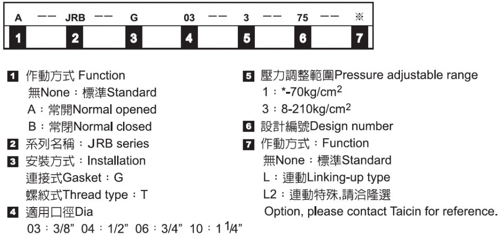 | 型式號碼 | 最大壓力 (KG/CM2) | 適用管徑 (PT) | 最大流量 (LPM) |