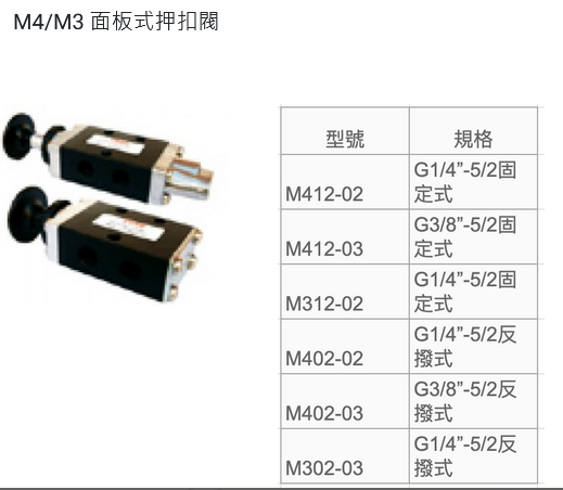 型號???? ? ? ? ? ? ? ? ? 規(guī)格 M412-02??????????? G1/4”-5/2固定式 M412-03??????????? G3/8”-5/2固定式 M312-02????????? ? G1/4”-5/2固定式 M402-02??????????? G1/4”-5/2固定式 M402-03????????? ? G3/