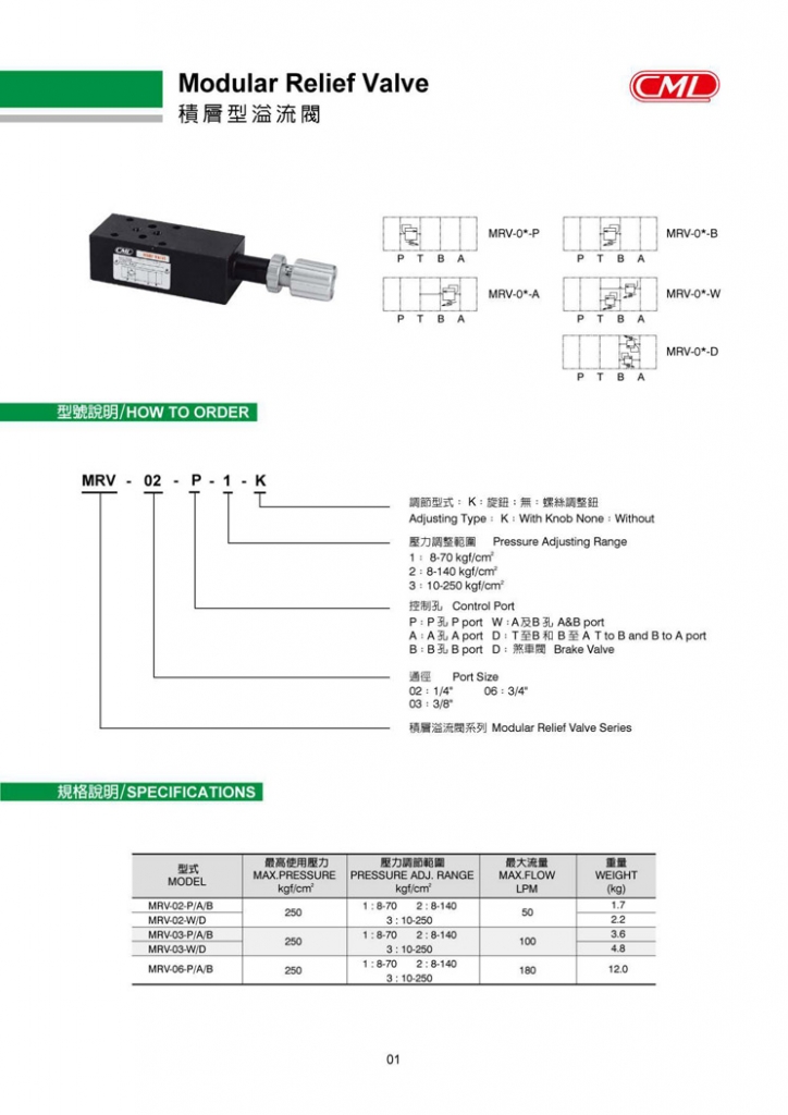 CML積層閥 , 積層型溢流閥 MRV-02,MRV-03系列型號(hào)參考: