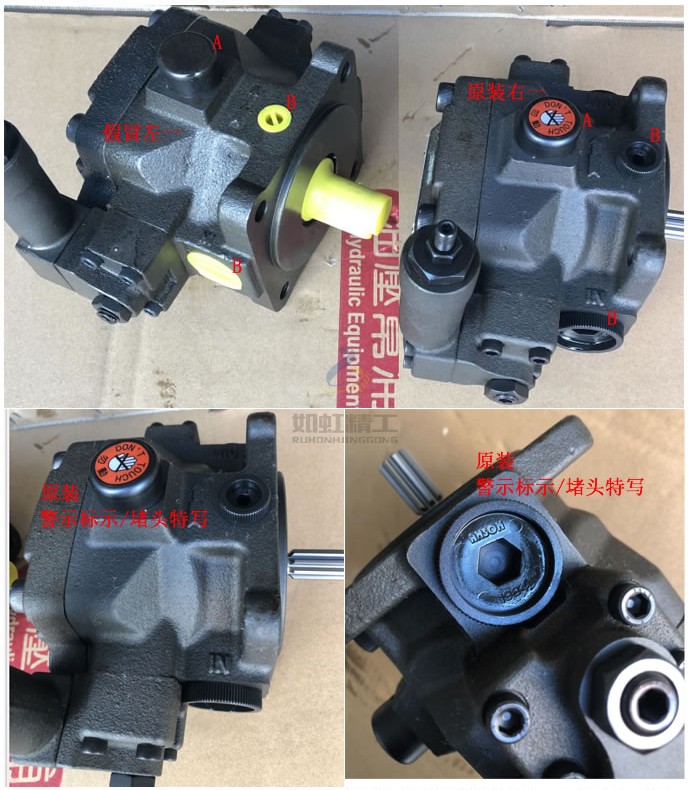 a∶假冒VP5F系列(左),警示勿動標(biāo)示大多數(shù)沒有或標(biāo)示粗糙隨意,如圖左A。油口堵頭為劣質(zhì)黃色/紅色塑料堵頭,靠暴力取出,如圖左B。