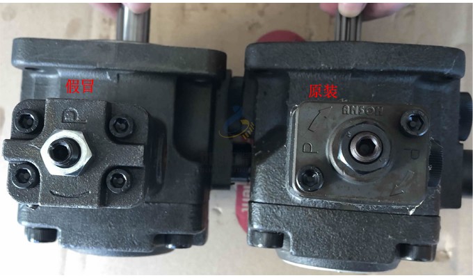 真假ANSON葉片泵區(qū)別2∶ 警示標(biāo)示/油口堵頭工藝差異。