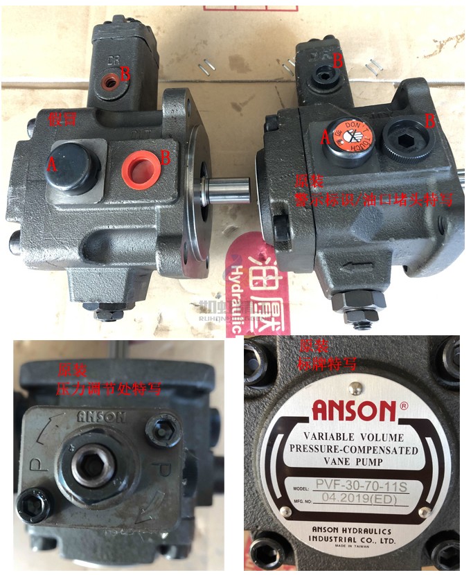 b∶原裝VP5F系列(右),警示勿動標(biāo)示標(biāo)志清楚,如圖右A,且不易掉落。油口堵頭特意設(shè)計內(nèi)六角,邊緣有大凸起有齒紋,如圖右A,方便取出。且堵頭上有英文標(biāo)示ANSON(上圖右為堵頭LOGO特寫)。